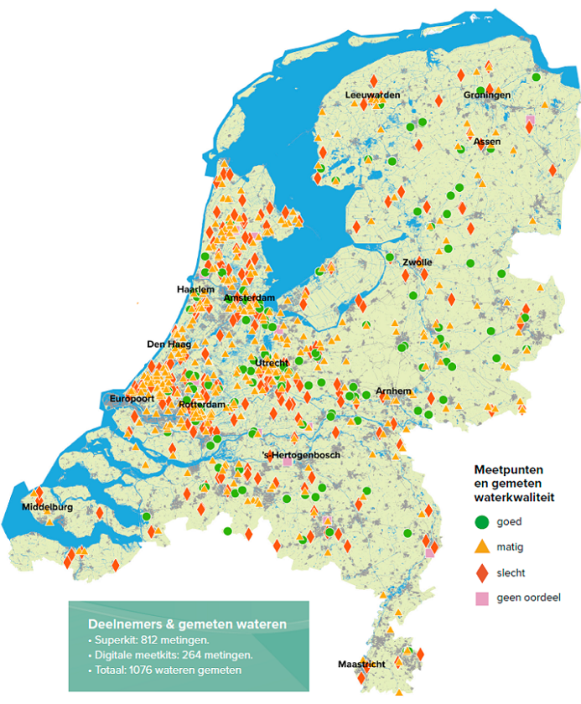 In 2027 moeten alle wateren in Nederland voldoen aan de Europese eisen voor waterkwaliteit (KRW). Uiterlijk in dat jaar moet al het water in Europa voldoende schoon en gezond zijn. Kleine wateren vormen samen een derde van het Nederlandse oppervlaktewater en vormen de haarvaten van het watersysteem. Ze vallen buiten de huidige verplichte metingen van waterkwaliteit. De resultaten van dit burgeronderzoek laten zien dat op basis van de gemeten parameters de kwaliteit van slechts 17% van de gemeten wateren goed is, van 51 % matig en van 32 % slecht. Kijkend naar het kaartje boven het artikel valt op dat het meten overwegend heeft plaatsgevonden in de Randstad. Daarnaast valt op dat de waterkwaliteit matig, het oranje driehoekje, overwegend voorkomt in de Randstad en dat de kwaliteit buiten de Randstad meer òf goed (groene rondje) òf slecht (rode wybertje) is. De gemeten waterkwaliteit bestaat uit drie onderdelen ecosysteemtoestand, voedingsstoffen en waterdieren. De ecosysteemtoestand heeft het grootste gewicht hierin en wordt bepaald door de helderheid van het water en de aanwezigheid van waterplanten.
