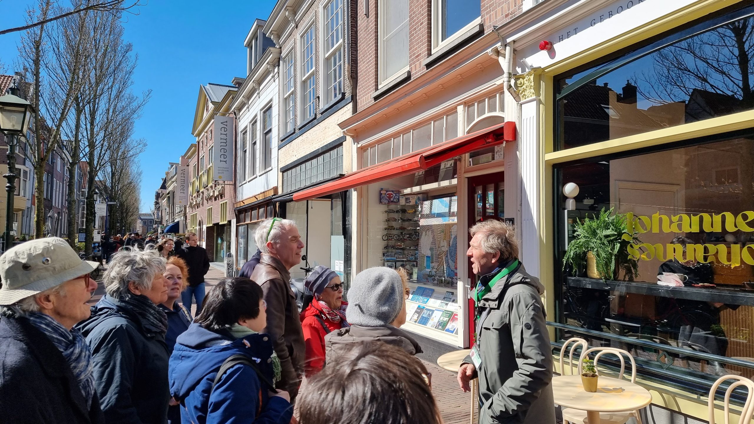 Op zondagmiddag 2 april maakten wij met een dertigtal een Vermeerwandeling door Delft. Wij verdeelden ons in twee groepen en iedere groep ging met een gids van het Gilde Delft op stap. Van het leven van Vermeer is relatief weinig bekend, maar omdat hij zijn hele leven in Delft gewoond en gewerkt heeft zijn er nu nog veel plekken die een rol in zijn leven hebben gespeeld. We startten bij Voldersgracht 25-26, zijn geboortehuis. Liepen door naar de hoek van de Oudemanhuissteeg, waar het huis stond waar Vermeer in opgroeide. Dit monumentale pand, Huis Mechelen geheten, is in 1885 gesloopt. Dat is een gevolg van de ligging, pal naast de toen smalle Oudemanhuissteeg. Voor verkeer dat via de Koepoort (dan nog aan het einde van de Vlamingstraat gelegen) en de Voldersgracht de stad inkwam, was de Oudemanhuissteeg de eerste gelegenheid om af te slaan naar de Markt, maar het boogbruggetje daar was smal en hoog. Omwonenden ergerden zich groen en geel aan de ‘volksverstoppingen en de daaruit ontstane onaangenaamheden’, vandaar de sloop om de steeg te verbreden.