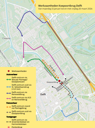Gemotoriseerd verkeer wordt omgeleid via de Reineveldbrug of de Sint Sebastiaansbrug. De Delfthopper rijdt via een aangepaste route. Kijk op de website van de vervoerder voor de actuele reisinformatie.